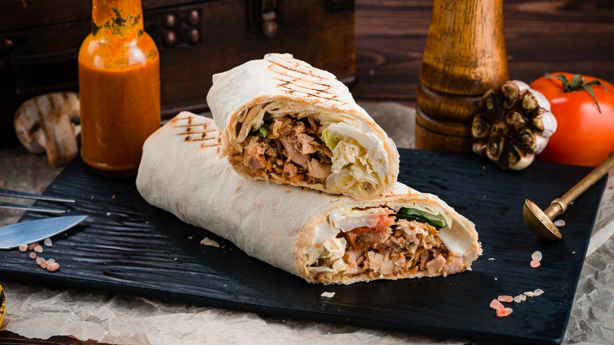 podwójne mięso, ser, frytki, sałata lodowa, kapusta, ogórek, pomidor, feta, oliwki, prażona cebula